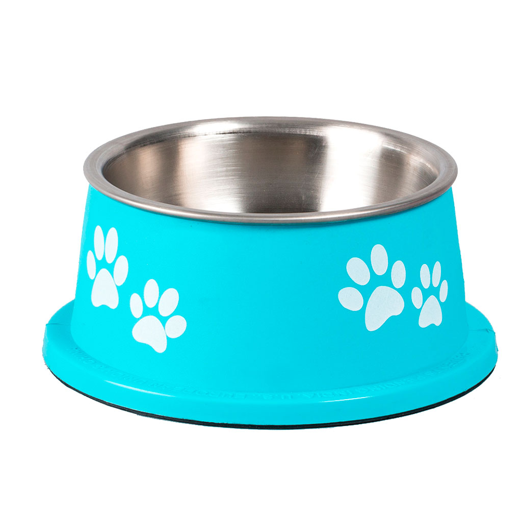 Hundskål av hög modell. Av hygieniskt rostfritt stål med en dekorativ plastutsida. Undersidan har en gummiring som gör att skålen håller sig på plats, vilket förhindrar spill och oljud
