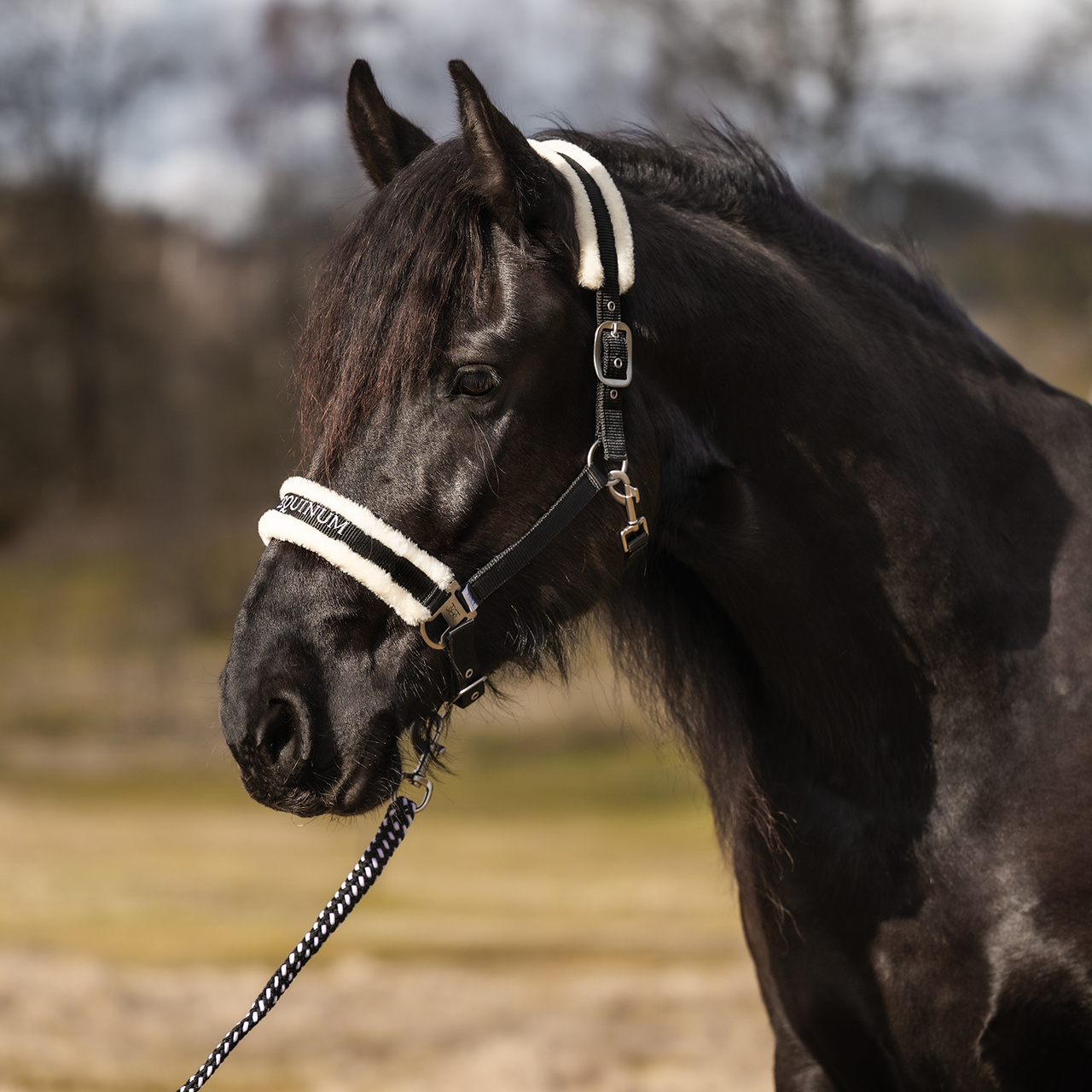 Grimma med silverfärgade spännen och mjuk fuskpälsfoder på nacke och nos. Broderad logo på nosrem.
