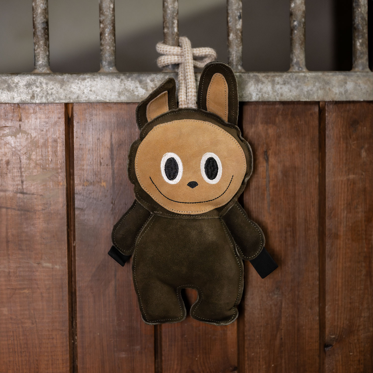 Hästleksak i mocka, perfekt för både funktion och dekoration. Utrustad med ett kraftigt rep för enkel upphängning samt resåröglor vid händerna – idealiska för att fästa exempelvis morötter eller andra godsaker.