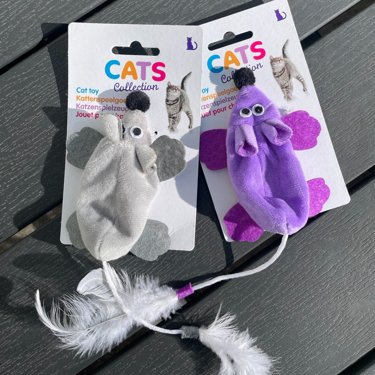 Tunn prasselleksak till katt. Med fjädersvans och filt-tassar.