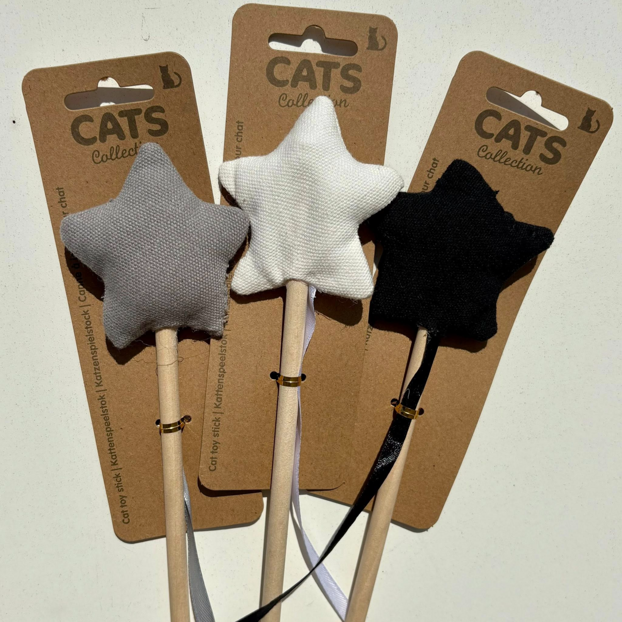 Kattspö med träpinne. Stjärna och snöre längst upp. Säljes i osorterade färger.