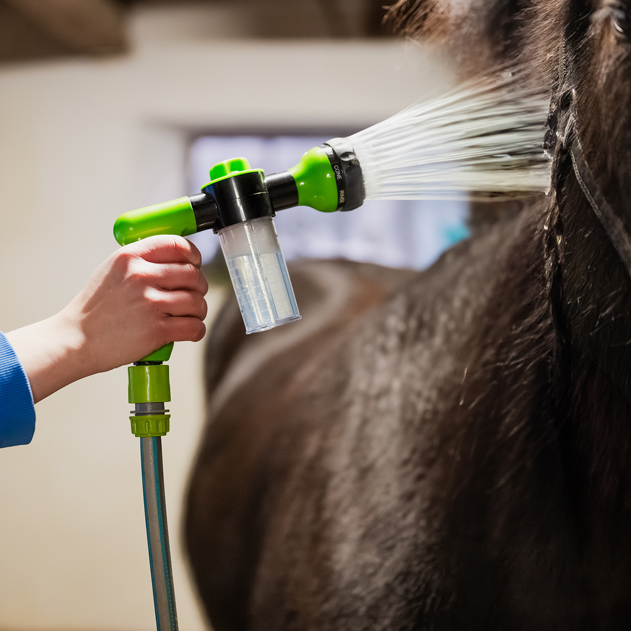 Munstycke med schampo-behållare. Rymmer 100ml. Tryck 2-15kg, räckvidd ca 5 meter. 8 olika "spray-varianter". Levereras med 3 kopplingar.