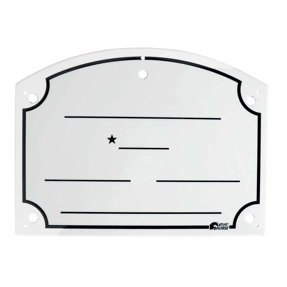 Klassisk boxskylt av plast för att skriva hästens namn, födelsedag och ägare. Även plats för extra anteckningar vid behov.
