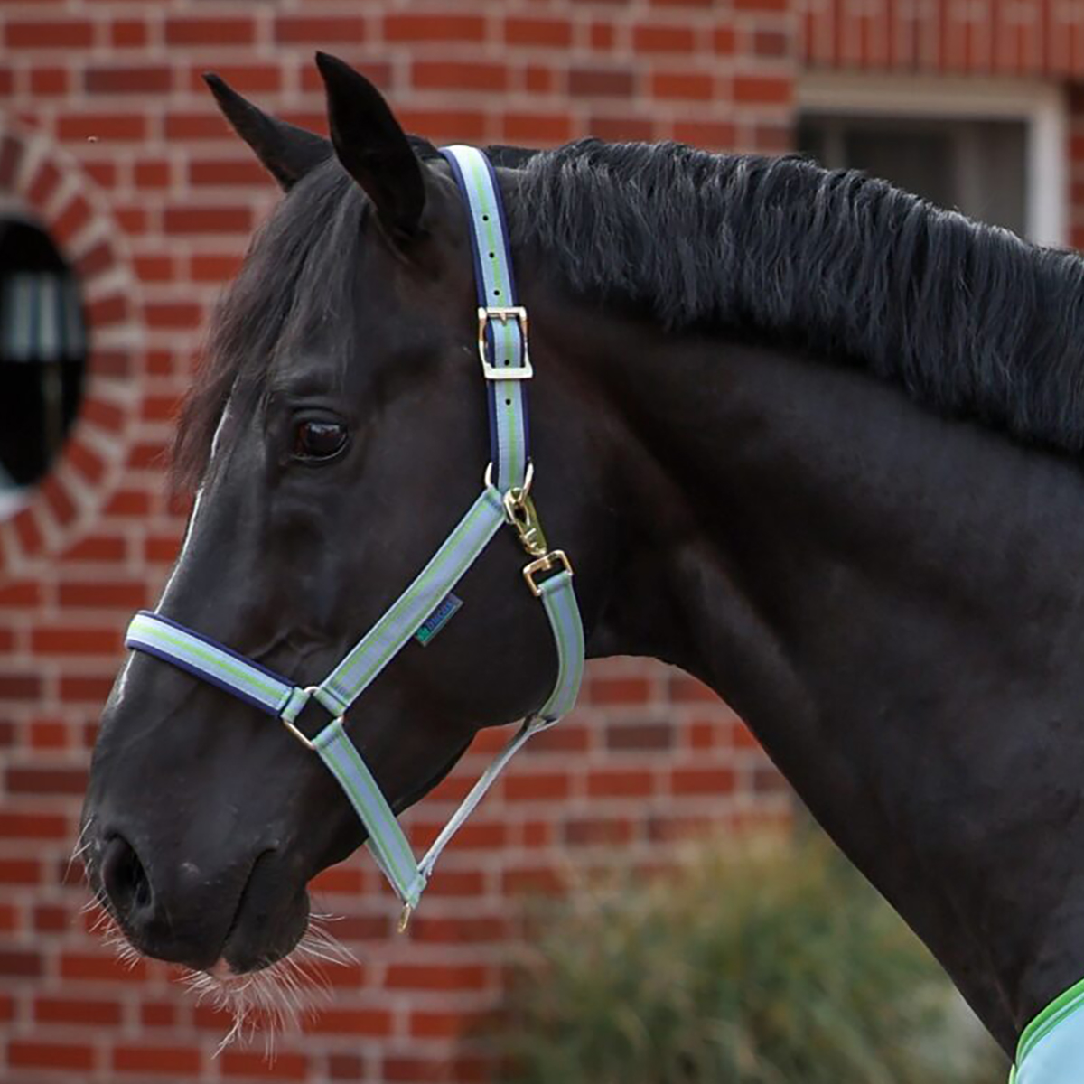 Dobbeltsyet i nylonbånd. Foret i næse- og nakkerem med blødt neoprenfor. Lukkes med rullespænde. Hægte i kæberem knappes i formet løkke.