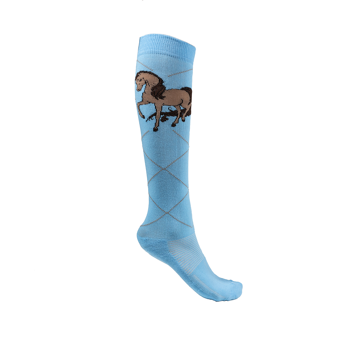 Stretchig ridstrumpa. Designad med kanalstickning vid vristen för en flexibel passform och en något tjockare fotdel för extra komfort. Den har god andningsförmåga och är detaljerad med ett stilrent rutmönster samt en elegant broderad häst på vaden.