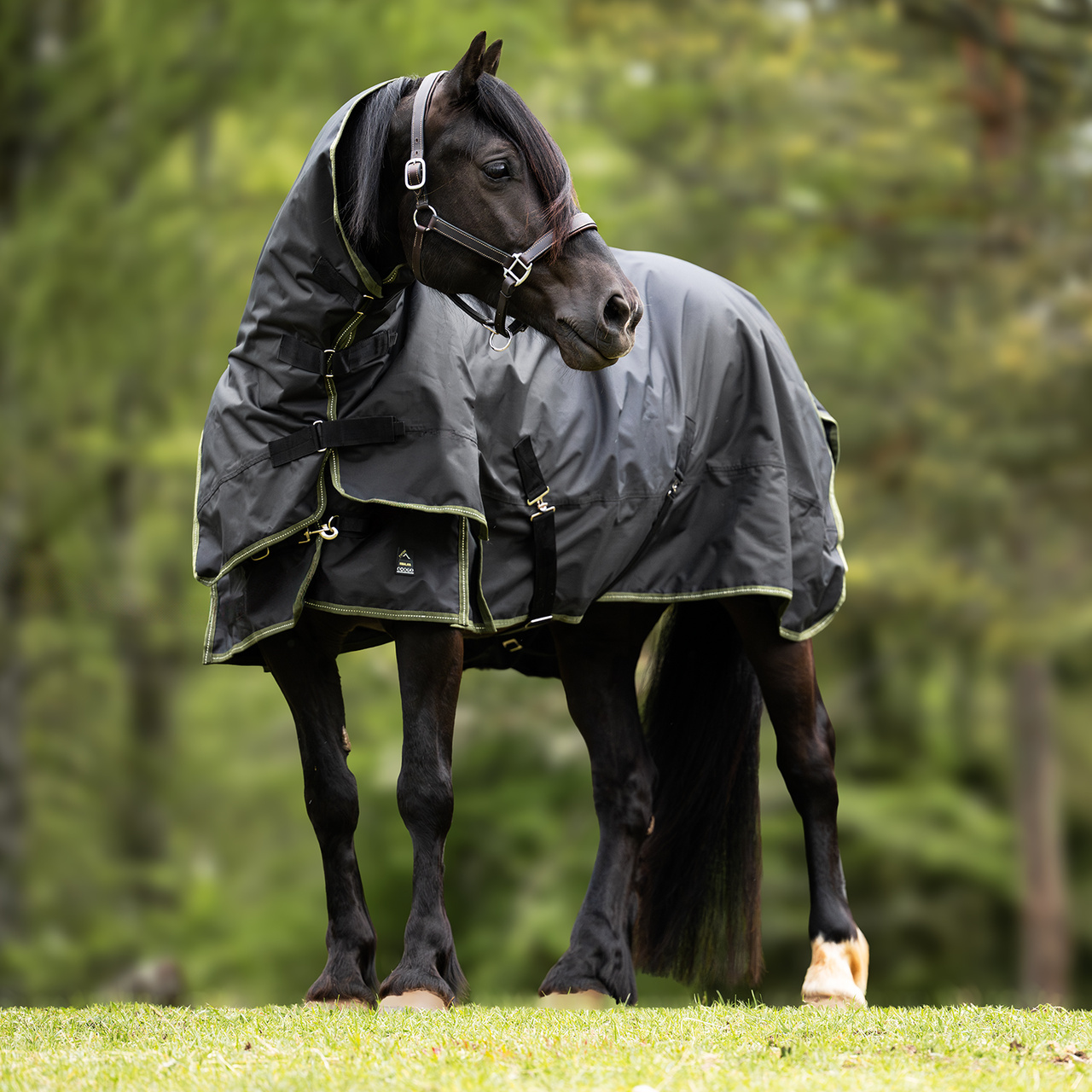 Lätt utetäcke med fast hals och 50g fyllning. Bra andningsfunktion och i 600 D ripstop. Vattentätt med vattenpelare 3000 mm och andasfunktion 3000 mvt. Täcket har två bogspännen med hakar, två kryssgjordar, elastiska benremmar och svansskydd. Halsen knäpps med kardborre. Bandkant med reflex söm.